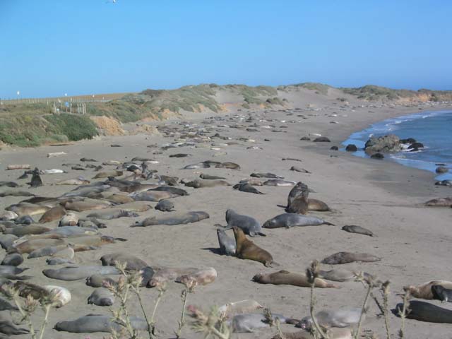 Molting season for elephant seals. If you look closely, you can see big chunks of skin falling off the seals.